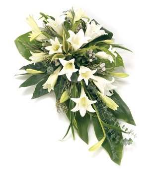 Traditional elegance with beautiful Longiflorum Lilies. A classic and stylish single ended spray of Longiflorum Lilies and complementary foliage.