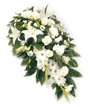 A classic white single ended spray. Roses, Lilies, Gladioli, Lisianthus, Chrysanthemums and Carnations with a touch of Rosemary, Cocculus and Salal to complete the arrangement.